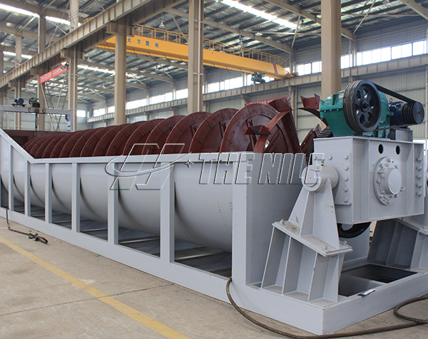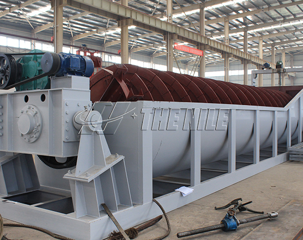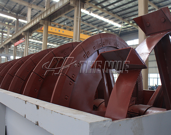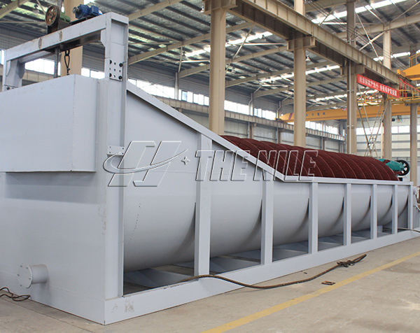 礦漿從槽子旁側(cè)中部的進(jìn)料口給入U(xiǎn)形槽中,隨著螺旋的低速回轉(zhuǎn)和連續(xù)不斷地?cái)嚢璧V漿,使得大部分輕而細(xì)的顆粒懸浮于上面,從溢流堰溢出,成為溢流產(chǎn)品;粗而重的顆粒將沉降于槽底(沉砂),被螺旋葉片推向斜槽上方并排出,輸送過(guò)程中同時(shí)完成脫水。若沉砂經(jīng)溜槽進(jìn)入磨機(jī)再磨,進(jìn)入磨機(jī)的沉砂便是返砂。